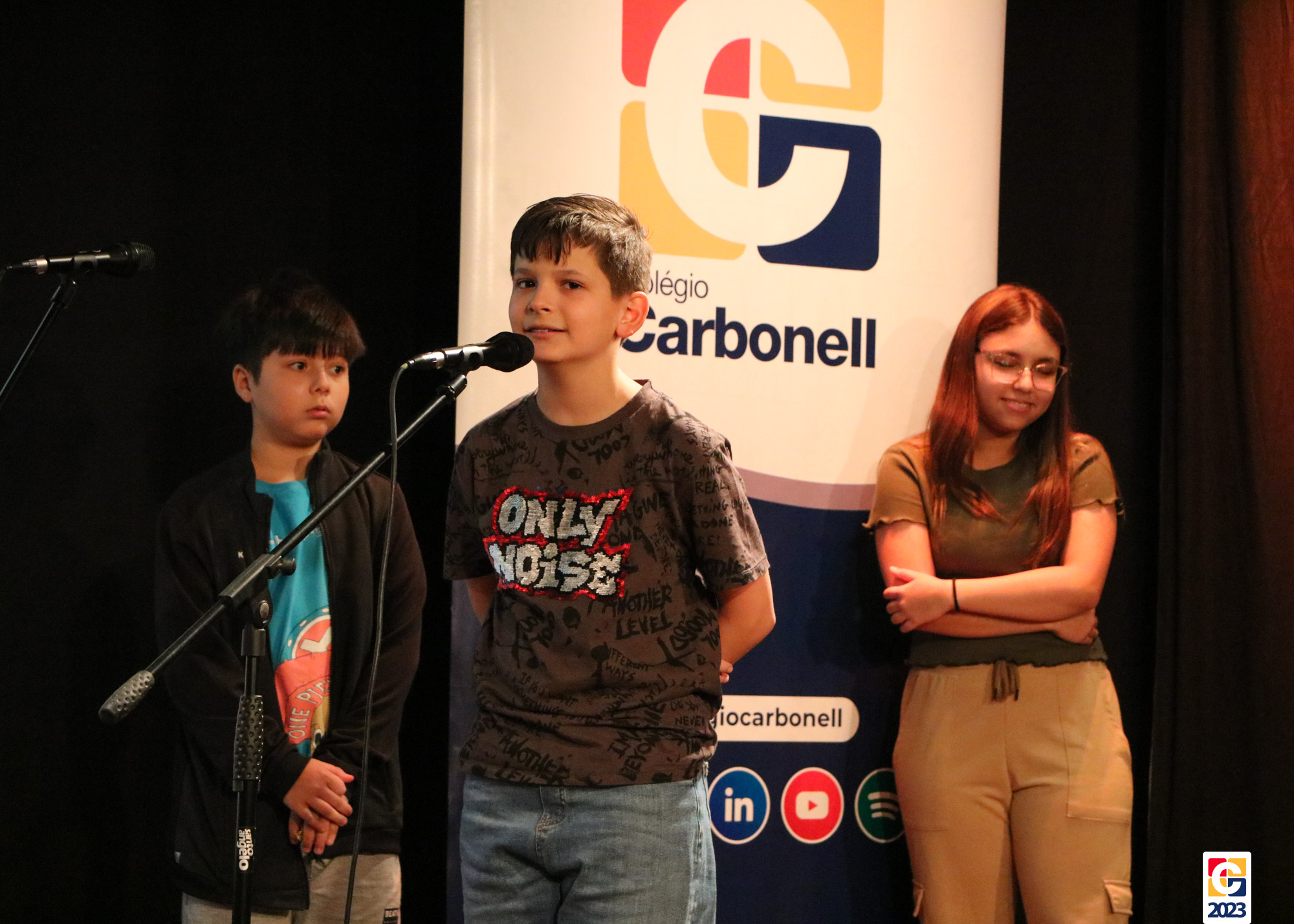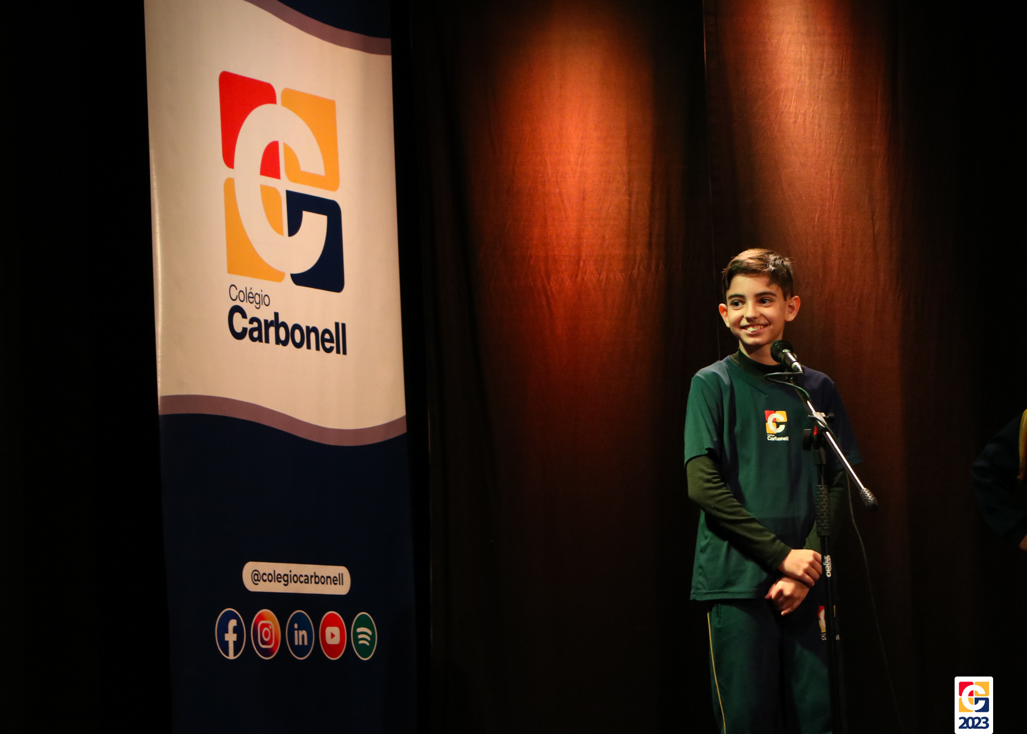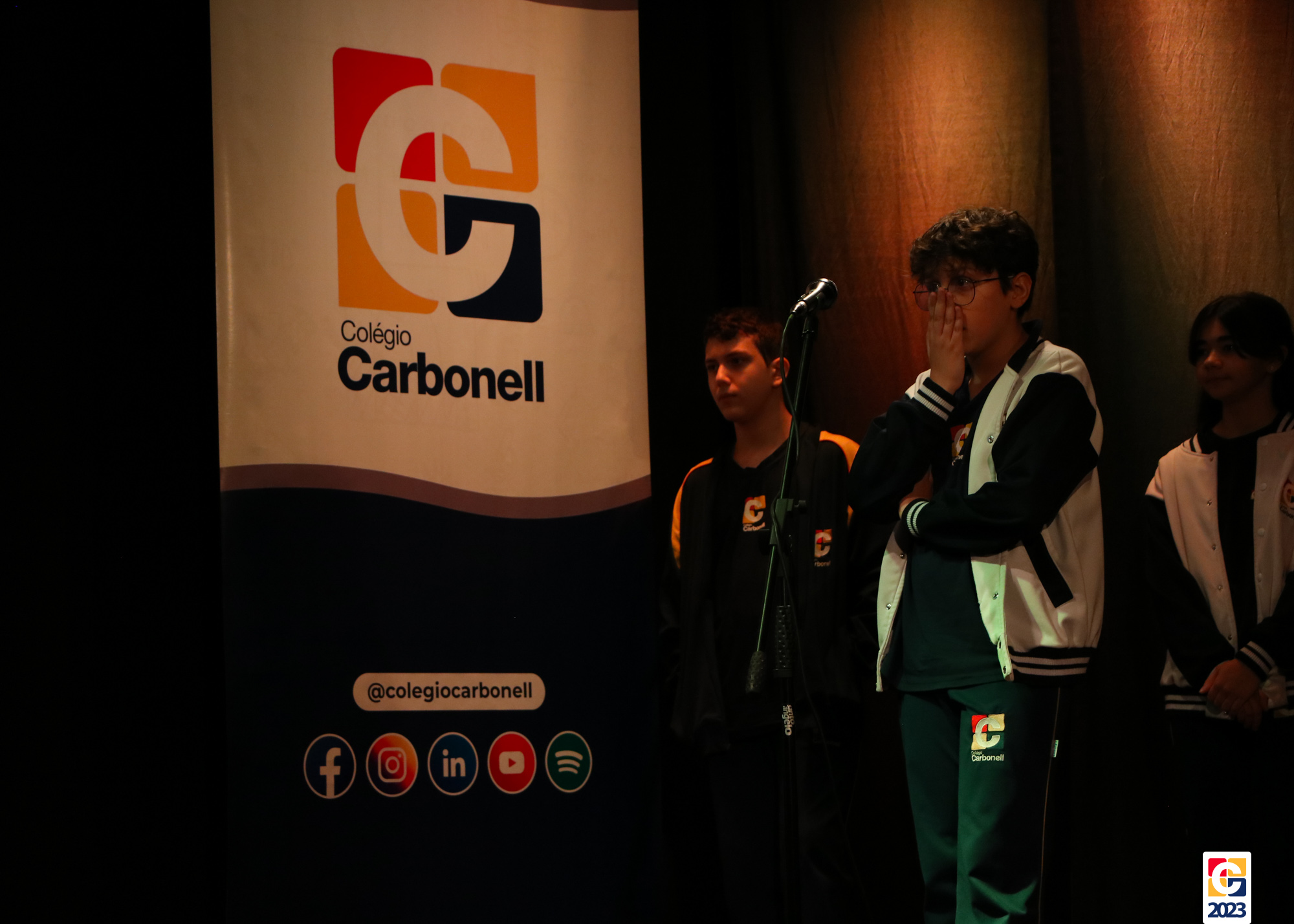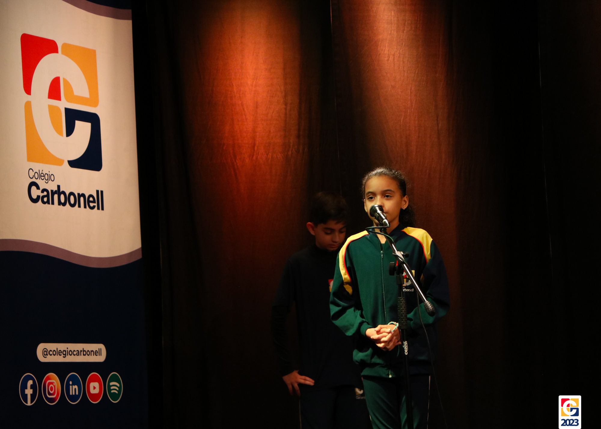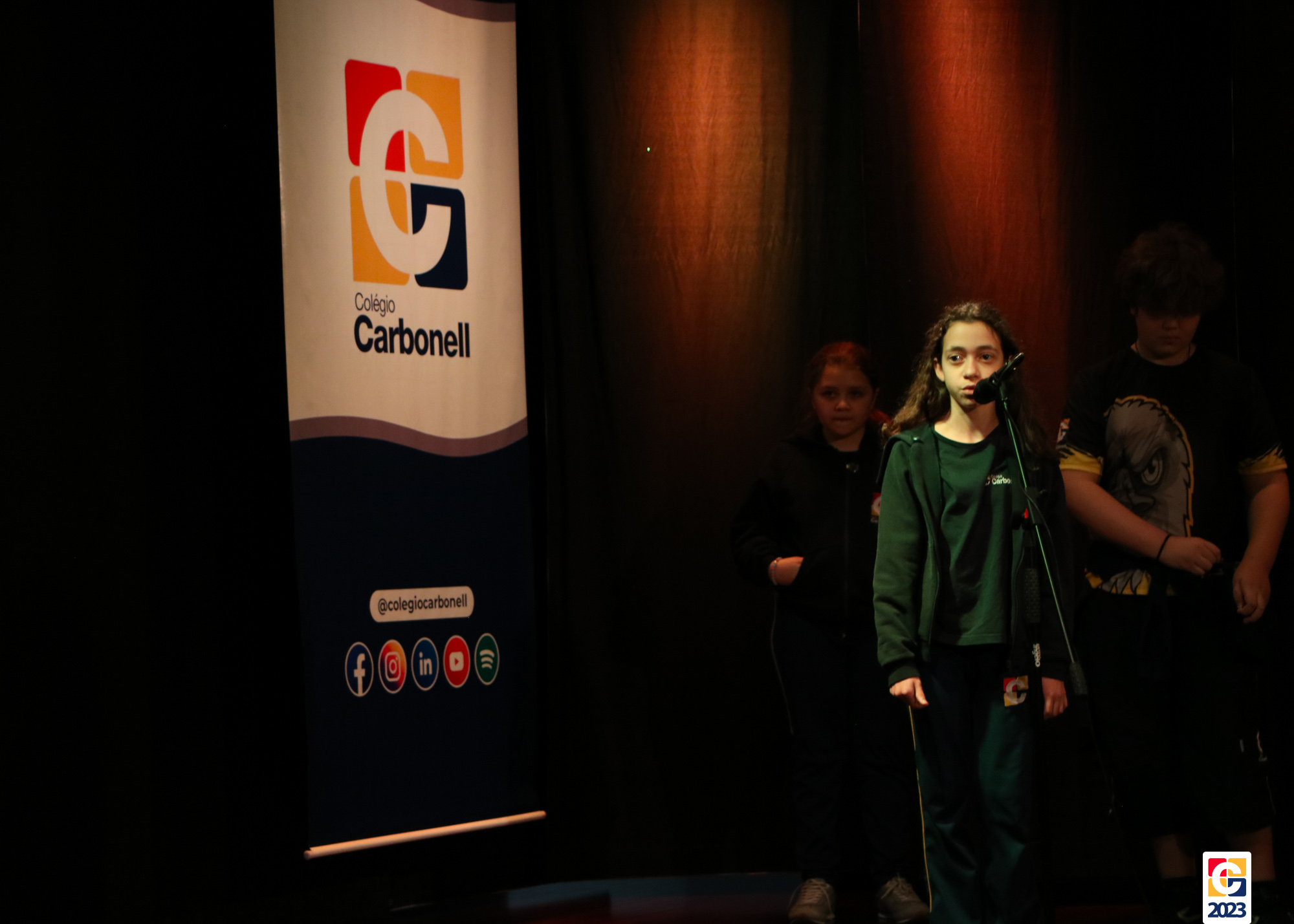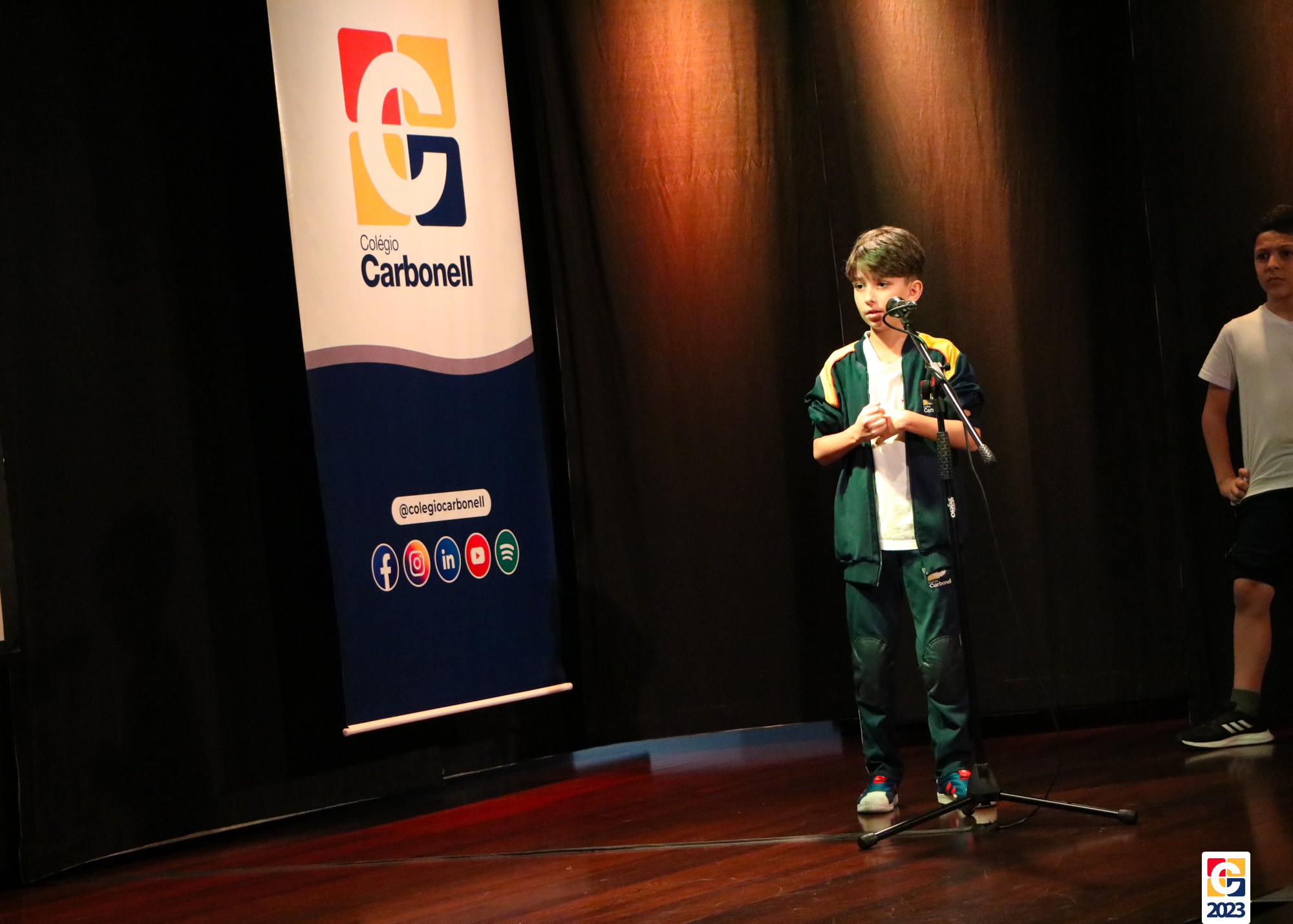 Mais uma vez, o Teatro Oswaldo Mazoni foi palco do Spelling Bee — competição de soletração em inglês para alunos dos Anos Iniciais ao Ensino Médio. A edição de 2023 aconteceu no último sábado (12), faz parte do currículo de inglês do Carbonell Language Program e foi iniciada já há alguns meses, em março, com etapas eliminatórias em grupos: 4º e 5º anos, 6º e 7º anos, 8º e 9º anos e, por fim, jovens do Ensino Médio. 💬