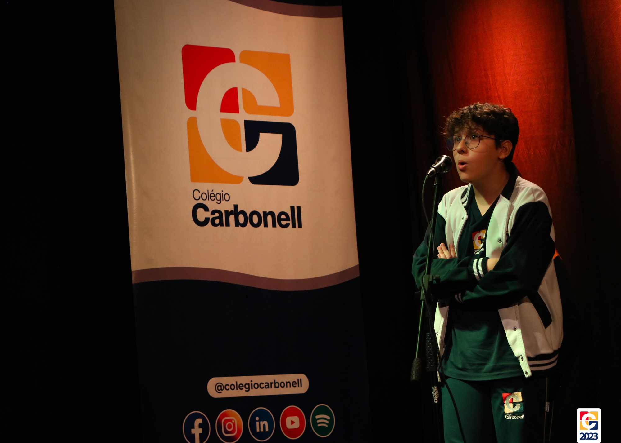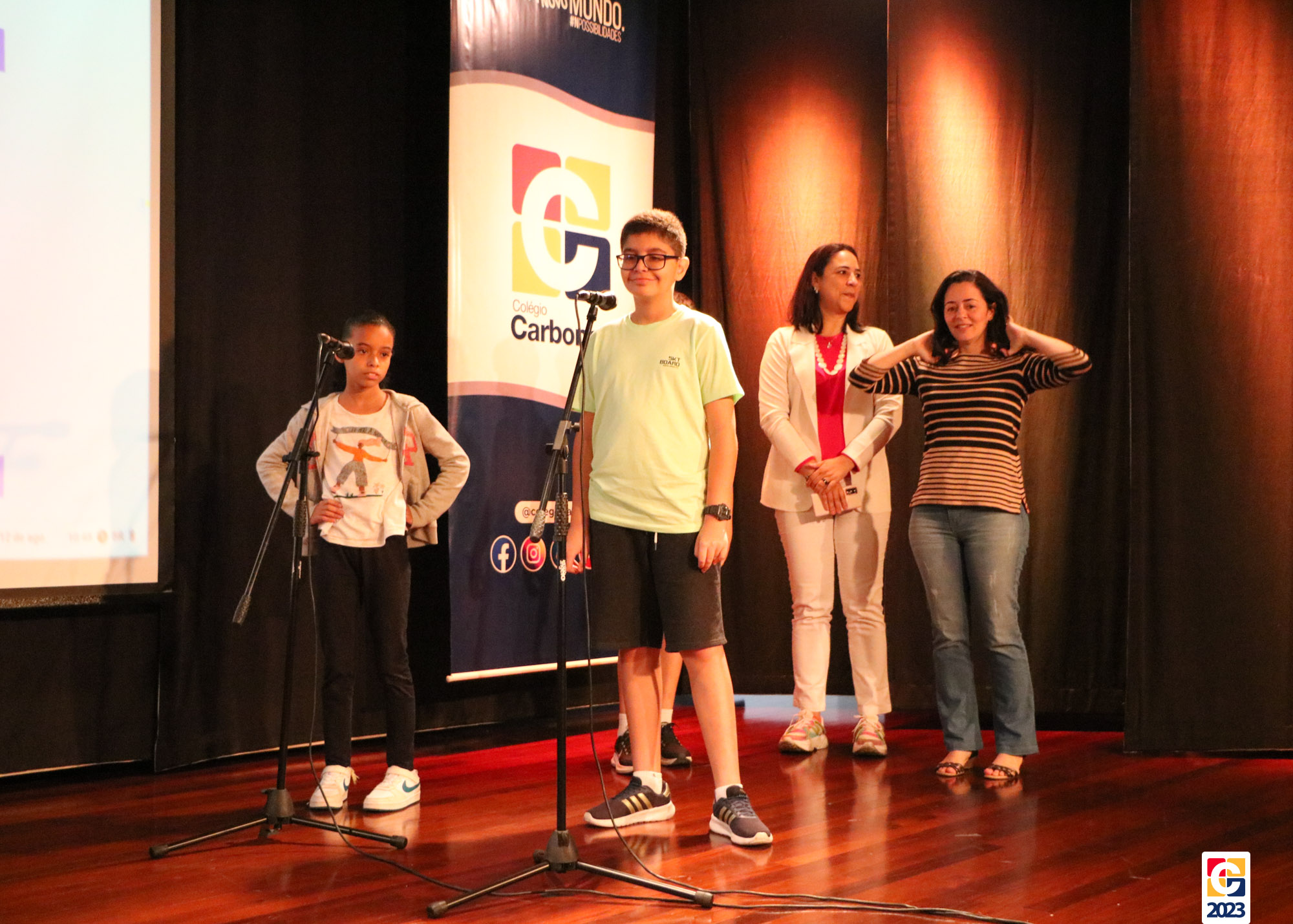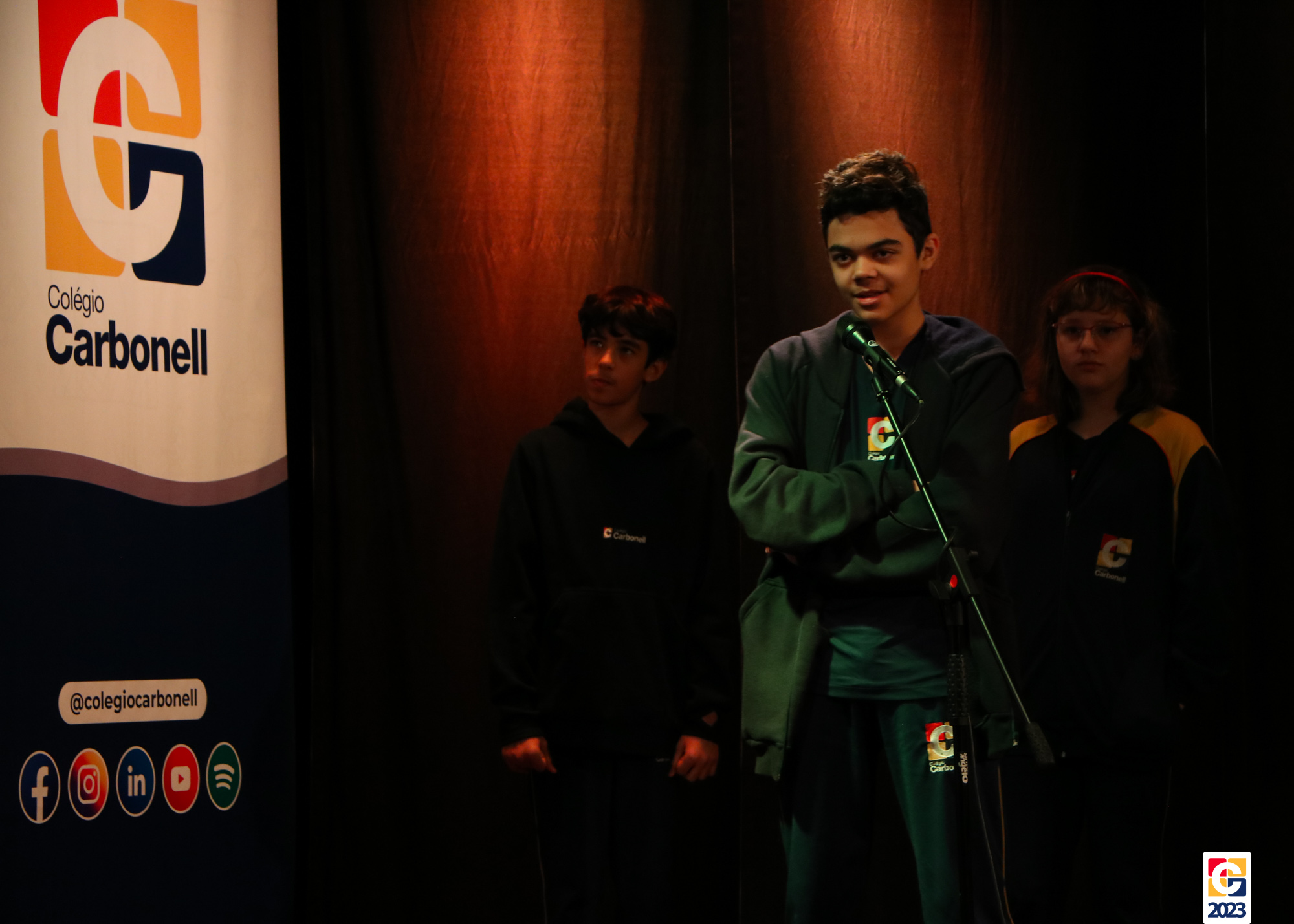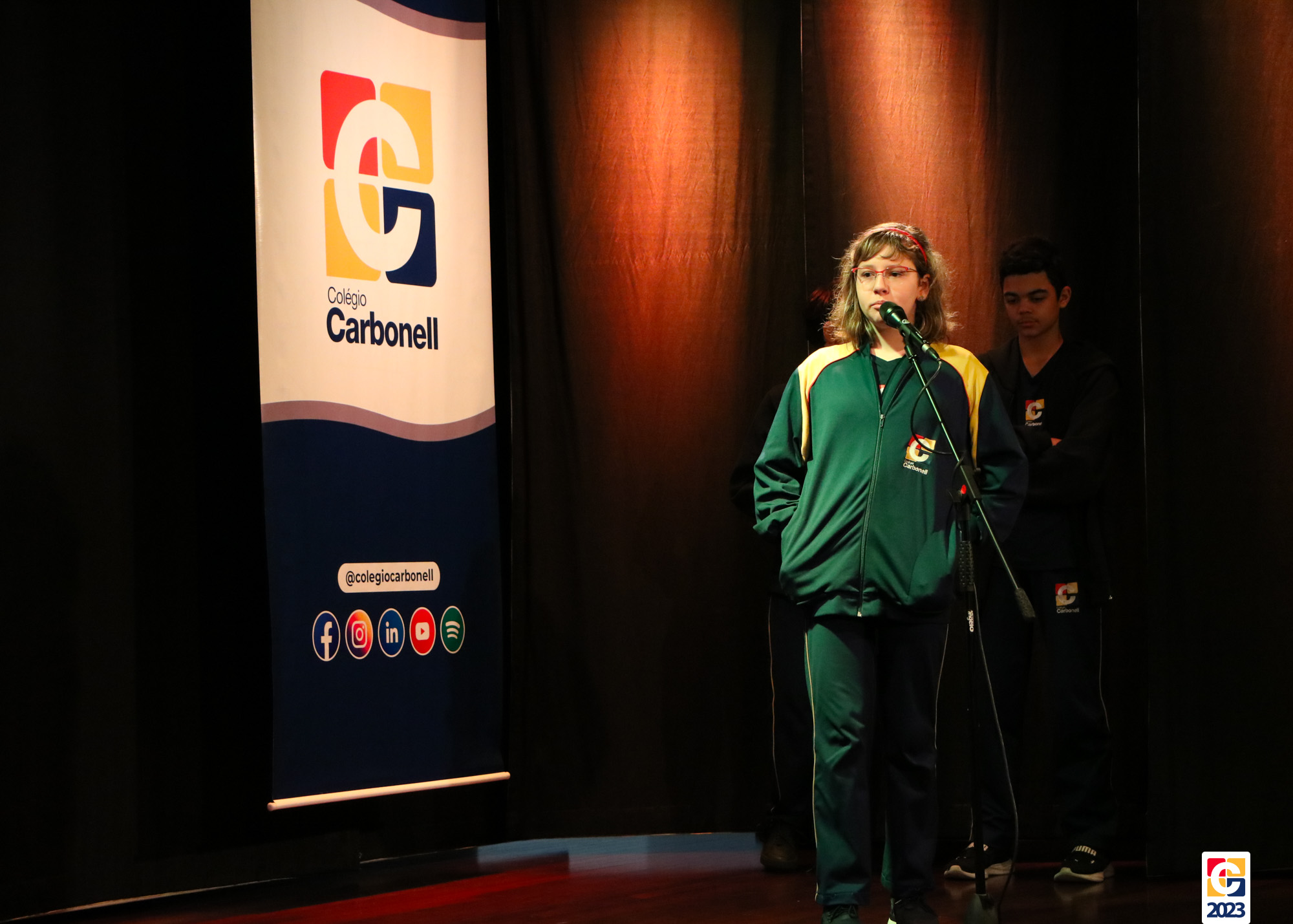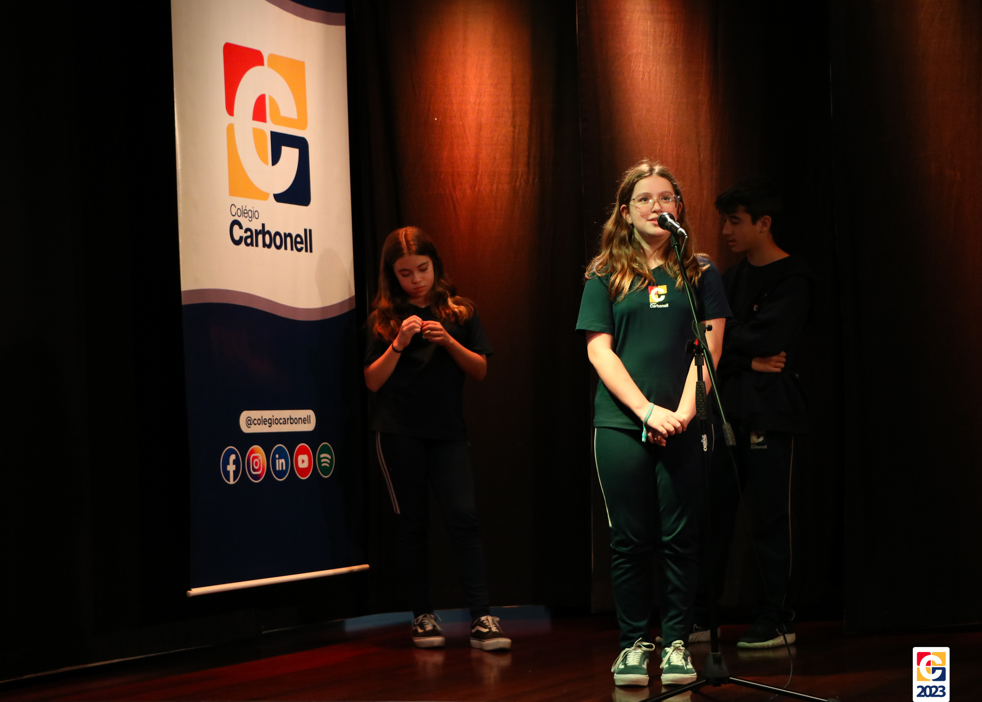 Mais uma vez, o Teatro Oswaldo Mazoni foi palco do Spelling Bee — competição de soletração em inglês para alunos dos Anos Iniciais ao Ensino Médio. A edição de 2023 aconteceu no último sábado (12), faz parte do currículo de inglês do Carbonell Language Program e foi iniciada já há alguns meses, em março, com etapas eliminatórias em grupos: 4º e 5º anos, 6º e 7º anos, 8º e 9º anos e, por fim, jovens do Ensino Médio. 💬