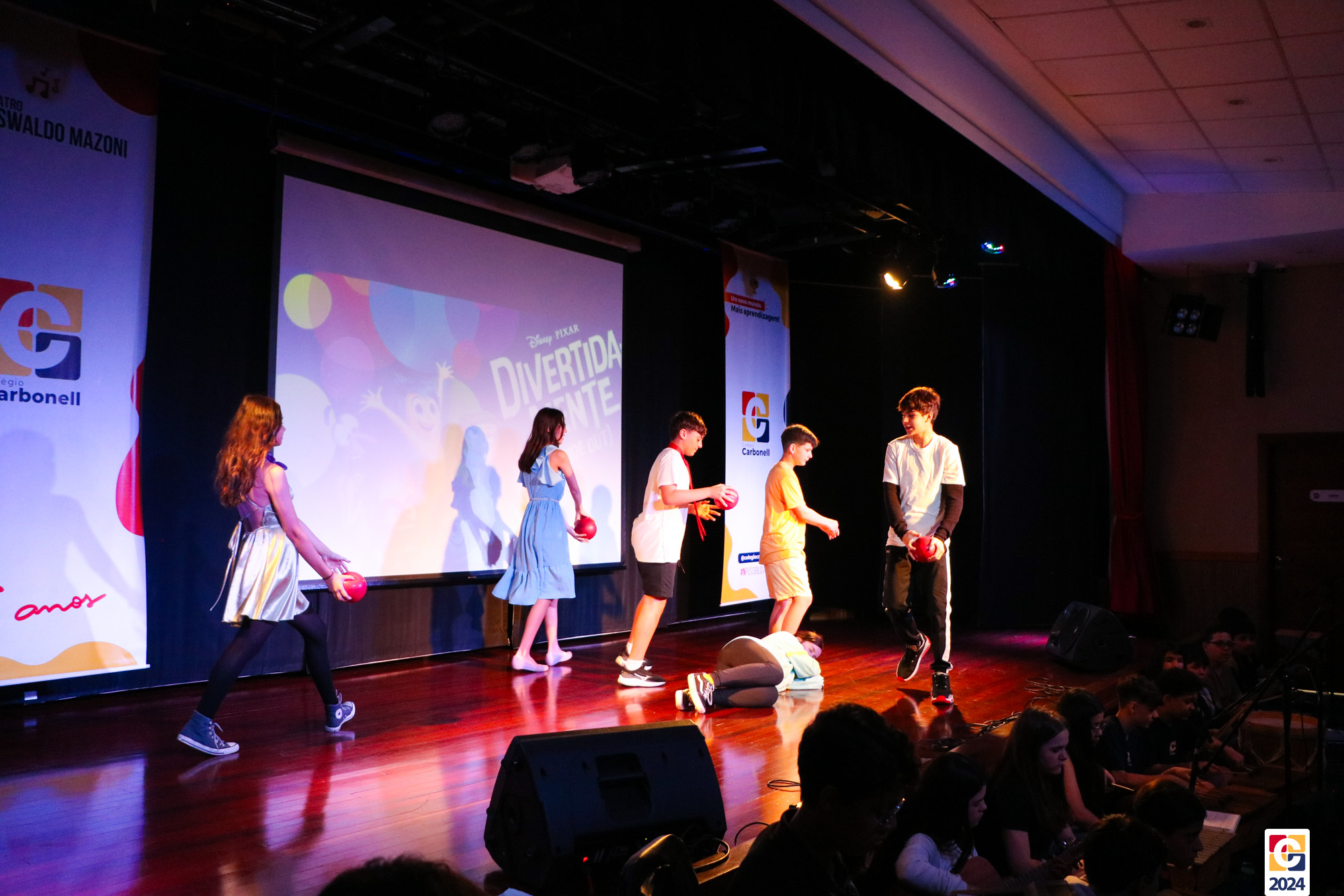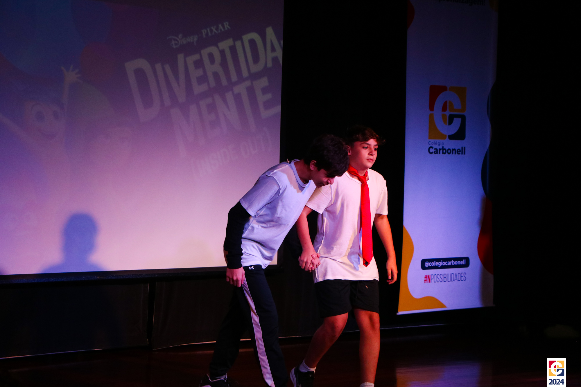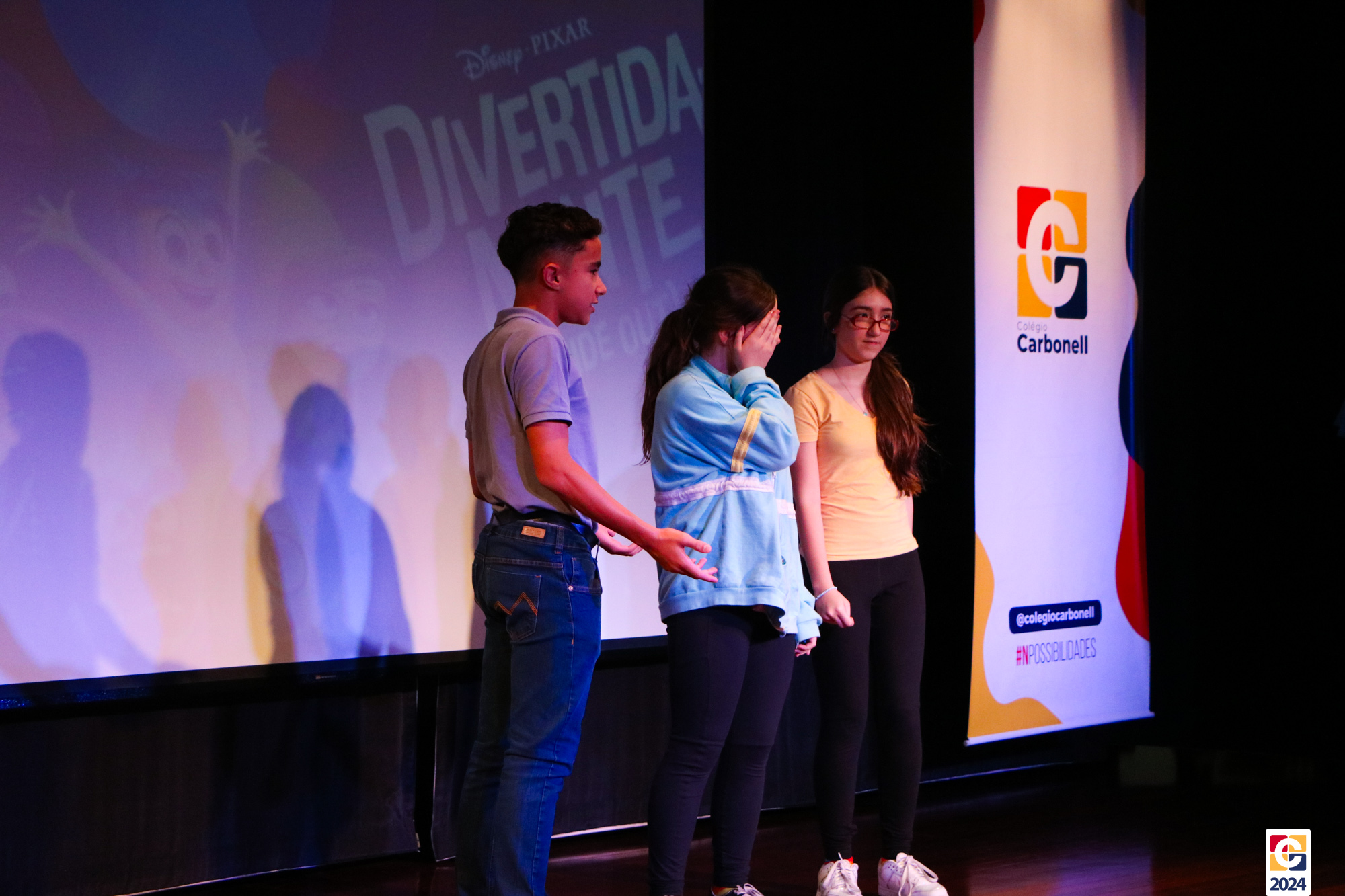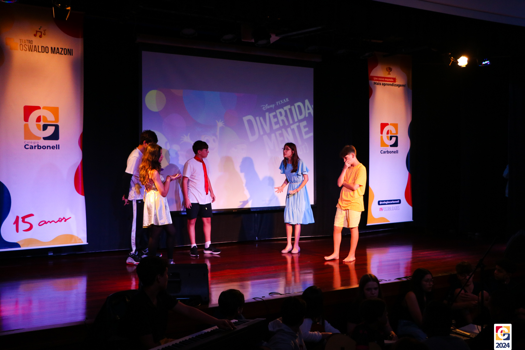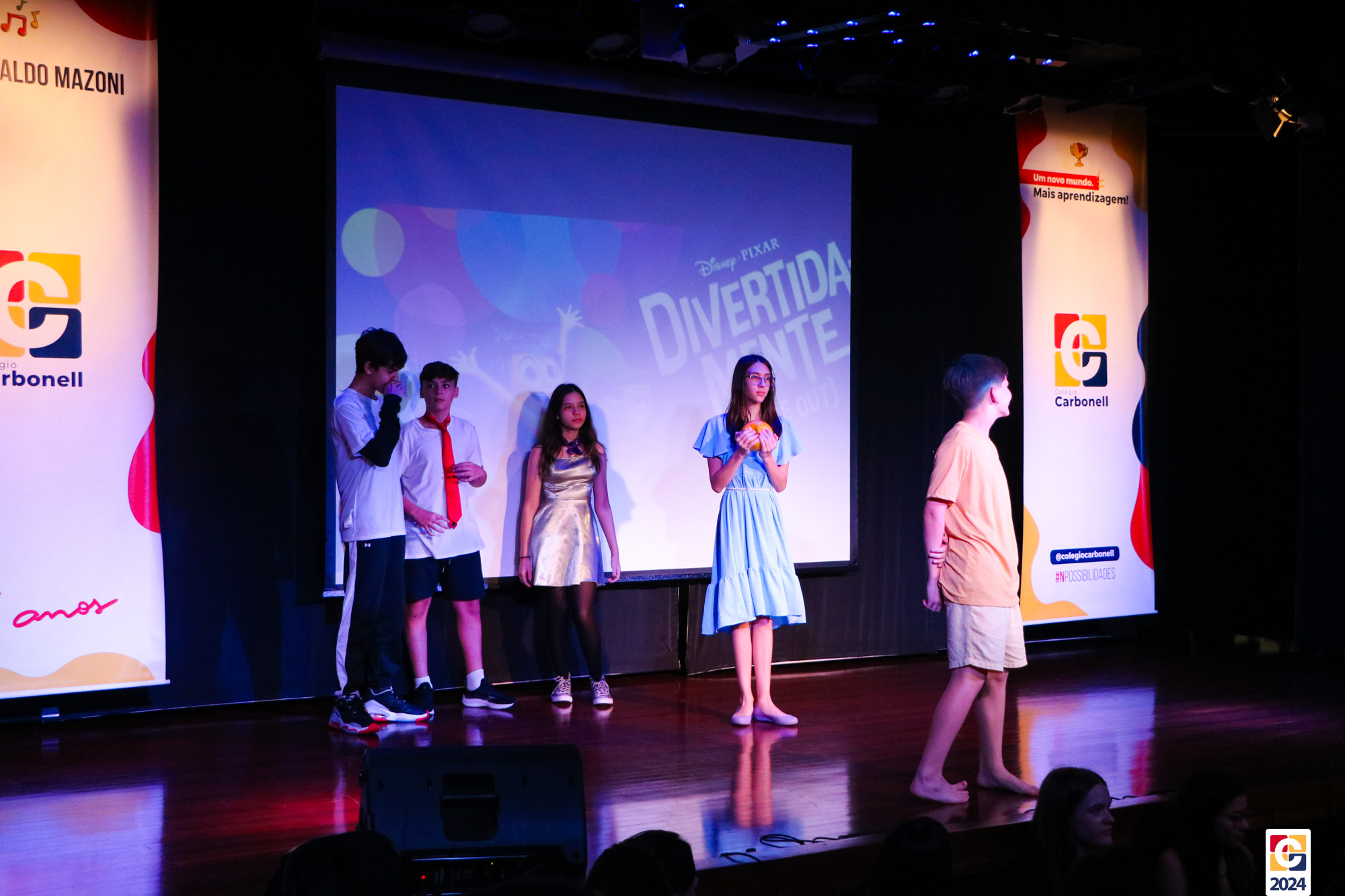 Os estudantes dos 8º anos do Colégio Carbonell protagonizaram uma apresentação especial da peça Divertida Mente no Teatro Oswaldo Mazoni, direcionada para as crianças dos Anos Iniciais. A história gira em torno de Riley, uma menina que enfrenta mudanças em sua vida, e suas emoções personificadas — Alegria, Tristeza, Medo, Raiva e Nojinho — que a ajudam a lidar com essas transições. A obra aborda temas como amizade, crescimento emocional e a importância de todas as emoções. 🌈