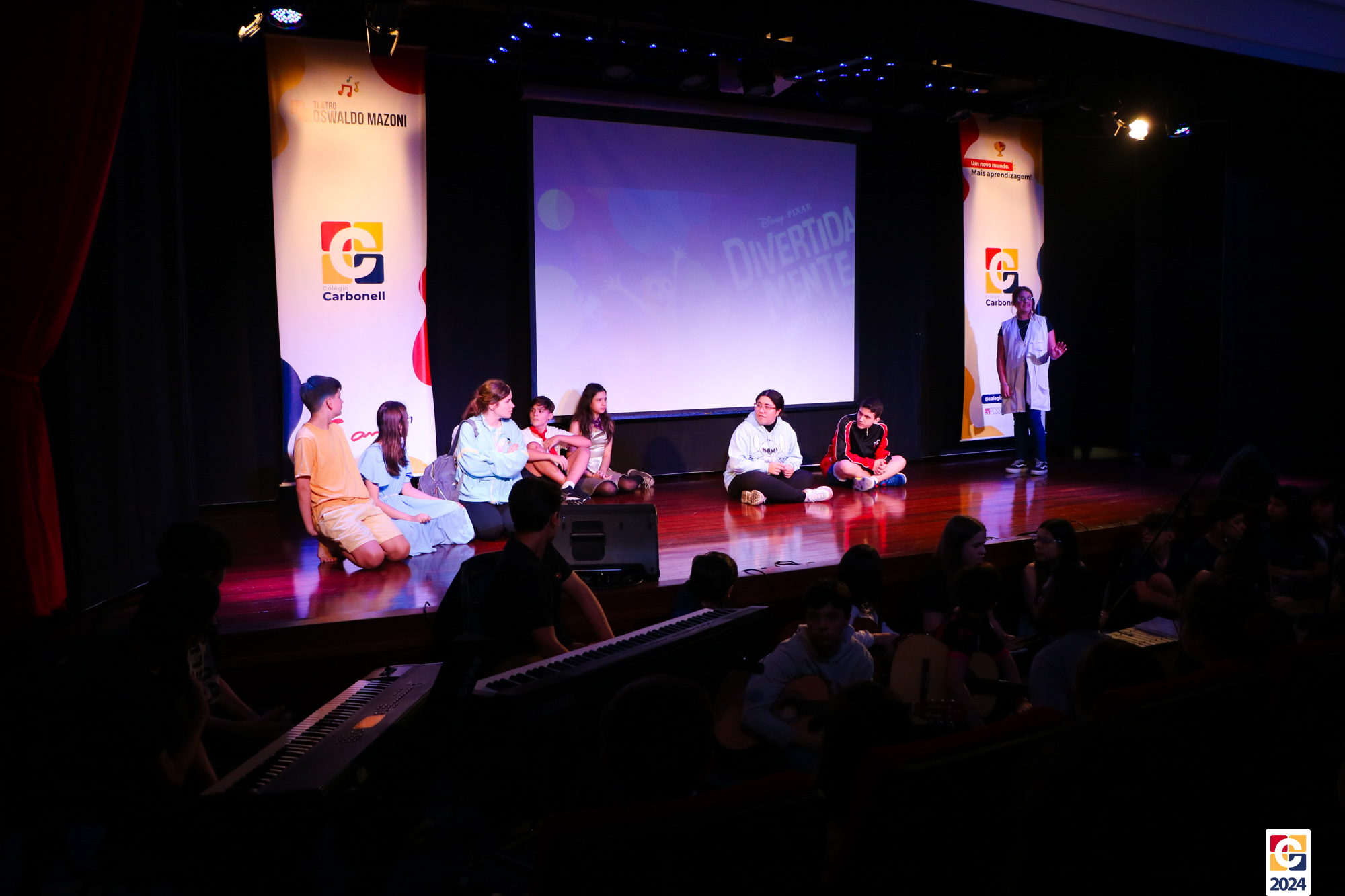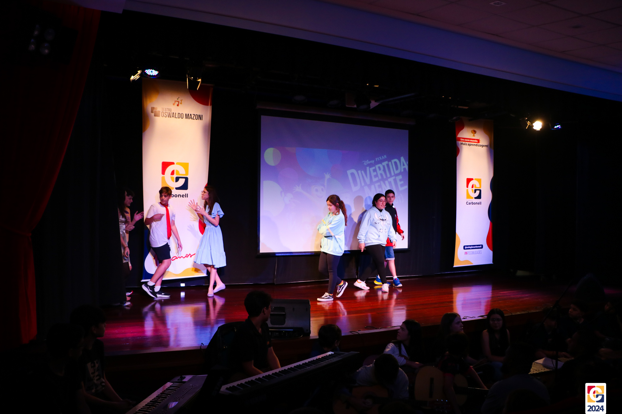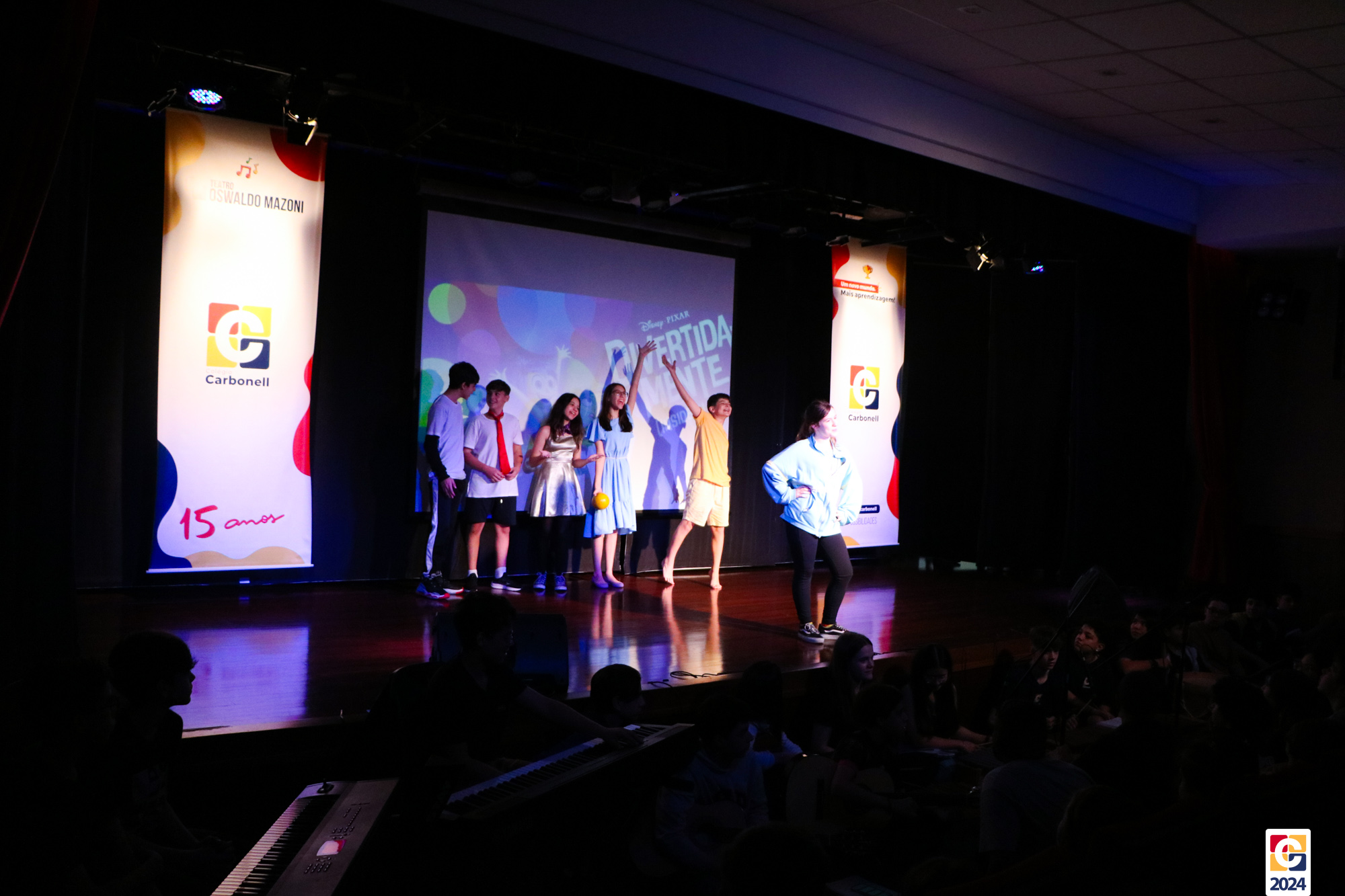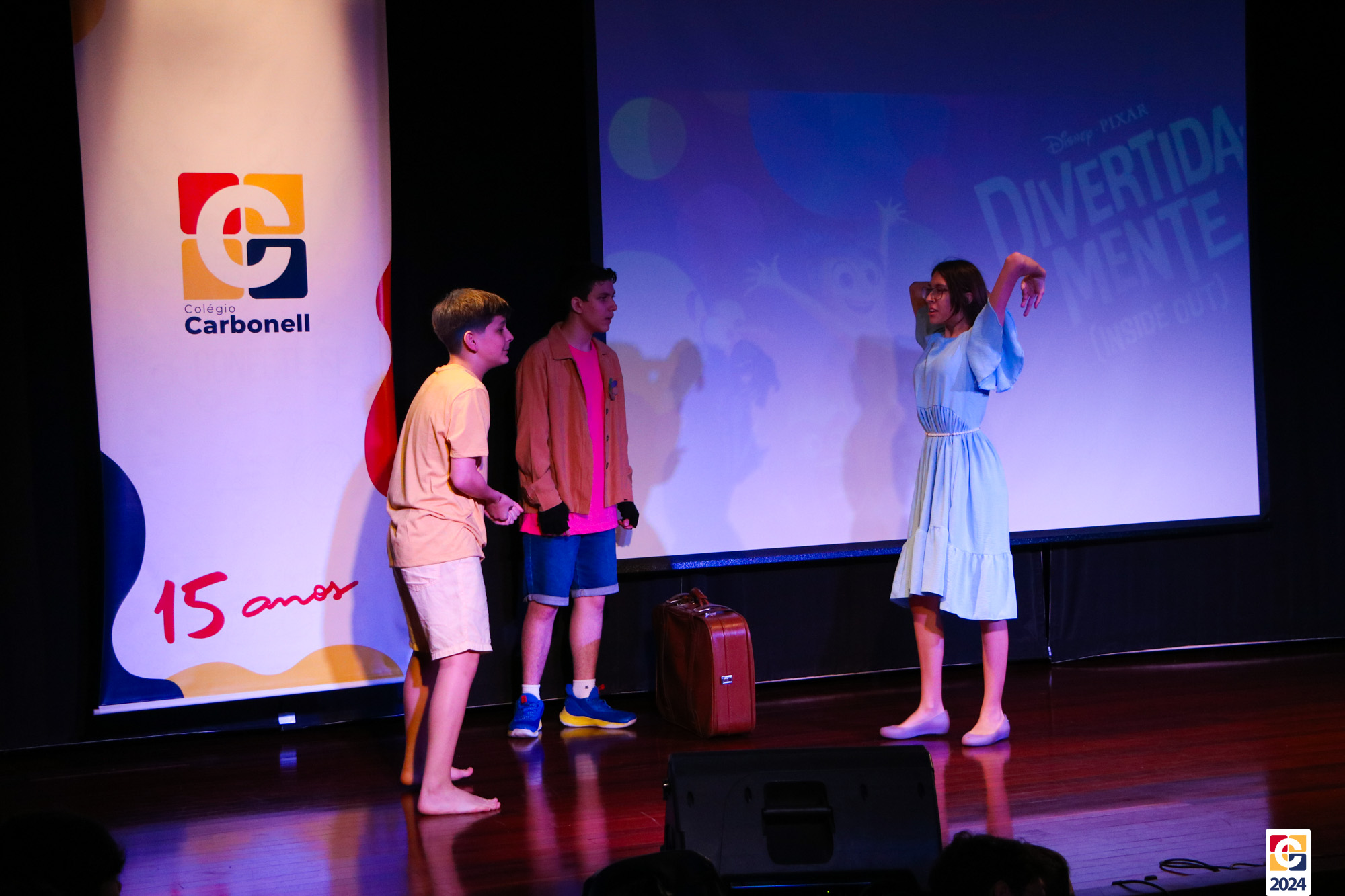 Os estudantes dos 8º anos do Colégio Carbonell protagonizaram uma apresentação especial da peça Divertida Mente no Teatro Oswaldo Mazoni, direcionada para as crianças dos Anos Iniciais. A história gira em torno de Riley, uma menina que enfrenta mudanças em sua vida, e suas emoções personificadas — Alegria, Tristeza, Medo, Raiva e Nojinho — que a ajudam a lidar com essas transições. A obra aborda temas como amizade, crescimento emocional e a importância de todas as emoções. 🌈