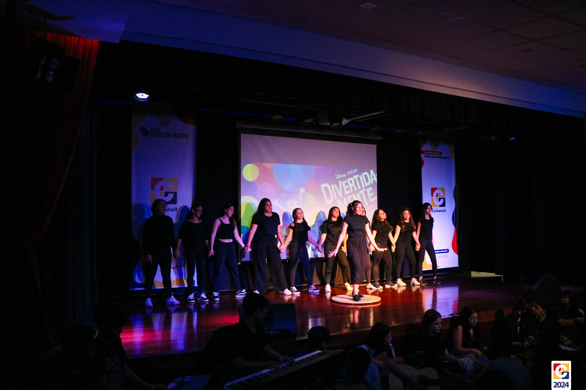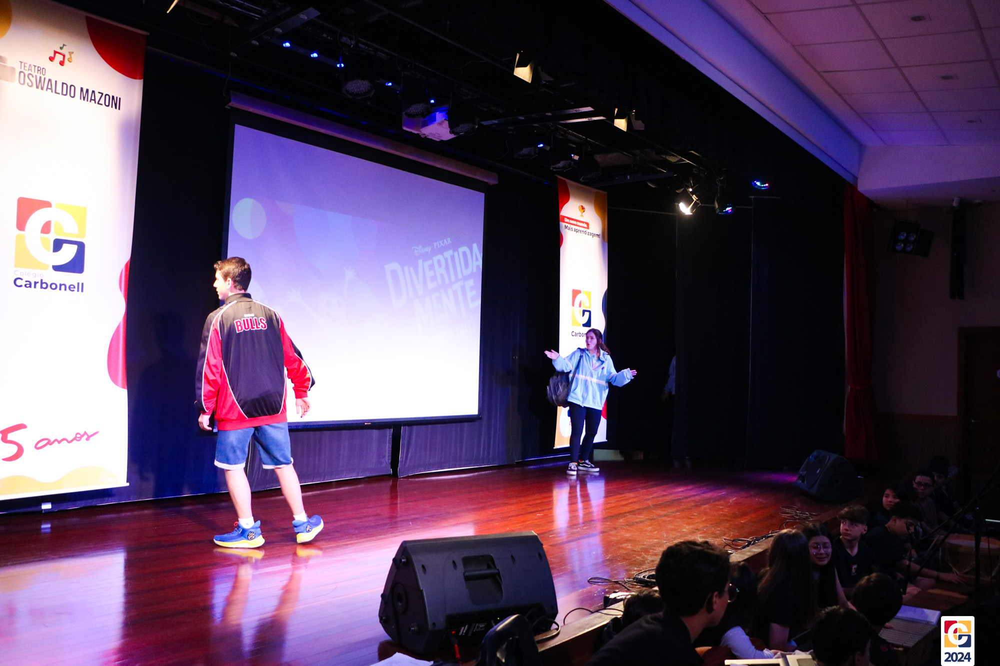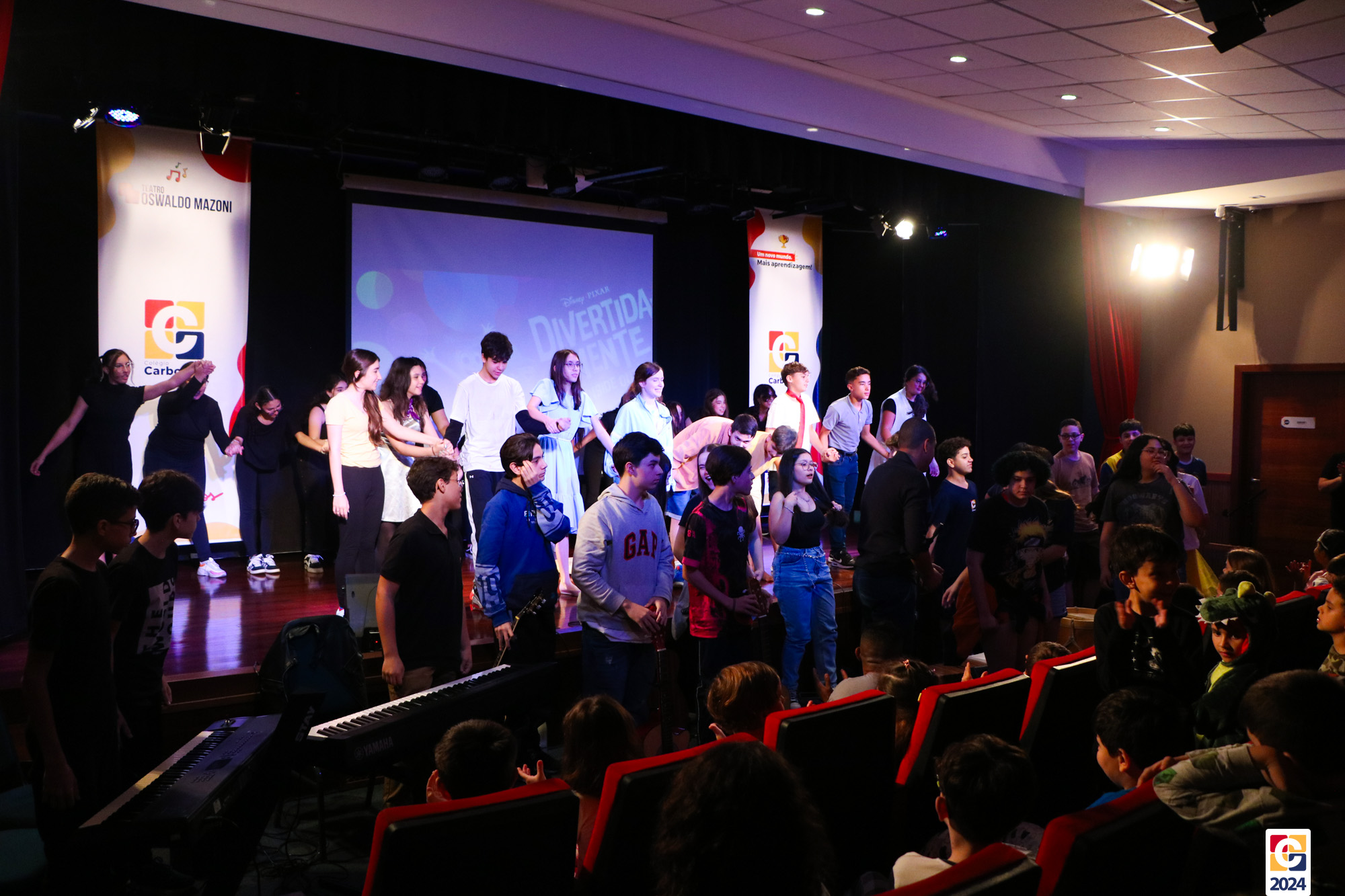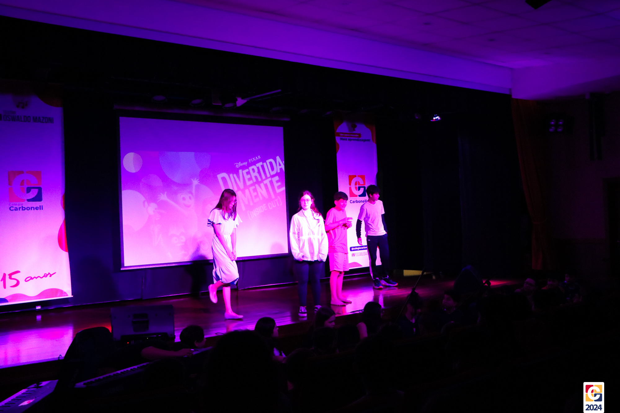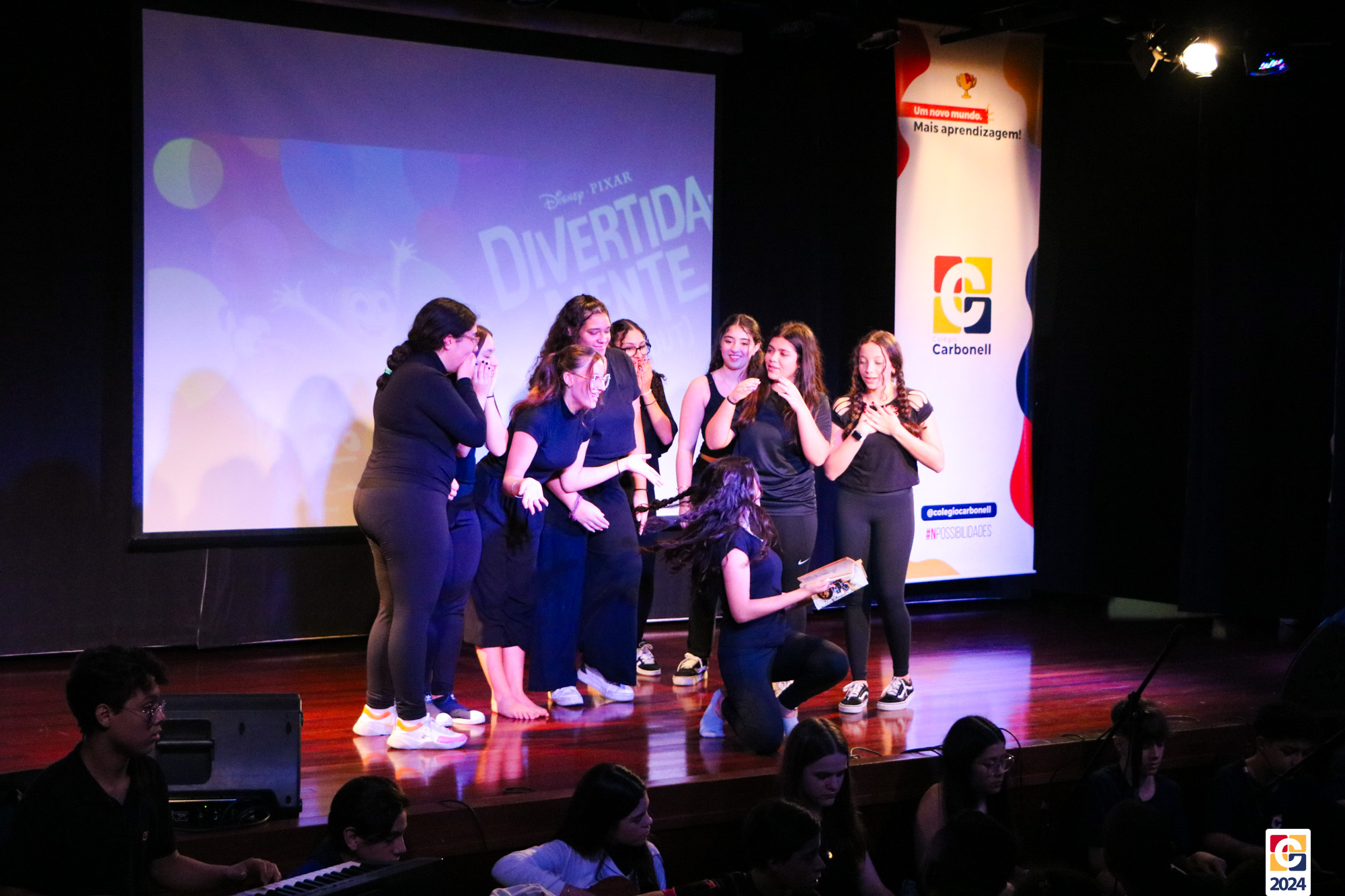 Os estudantes dos 8º anos do Colégio Carbonell protagonizaram uma apresentação especial da peça Divertida Mente no Teatro Oswaldo Mazoni, direcionada para as crianças dos Anos Iniciais. A história gira em torno de Riley, uma menina que enfrenta mudanças em sua vida, e suas emoções personificadas — Alegria, Tristeza, Medo, Raiva e Nojinho — que a ajudam a lidar com essas transições. A obra aborda temas como amizade, crescimento emocional e a importância de todas as emoções. 🌈
