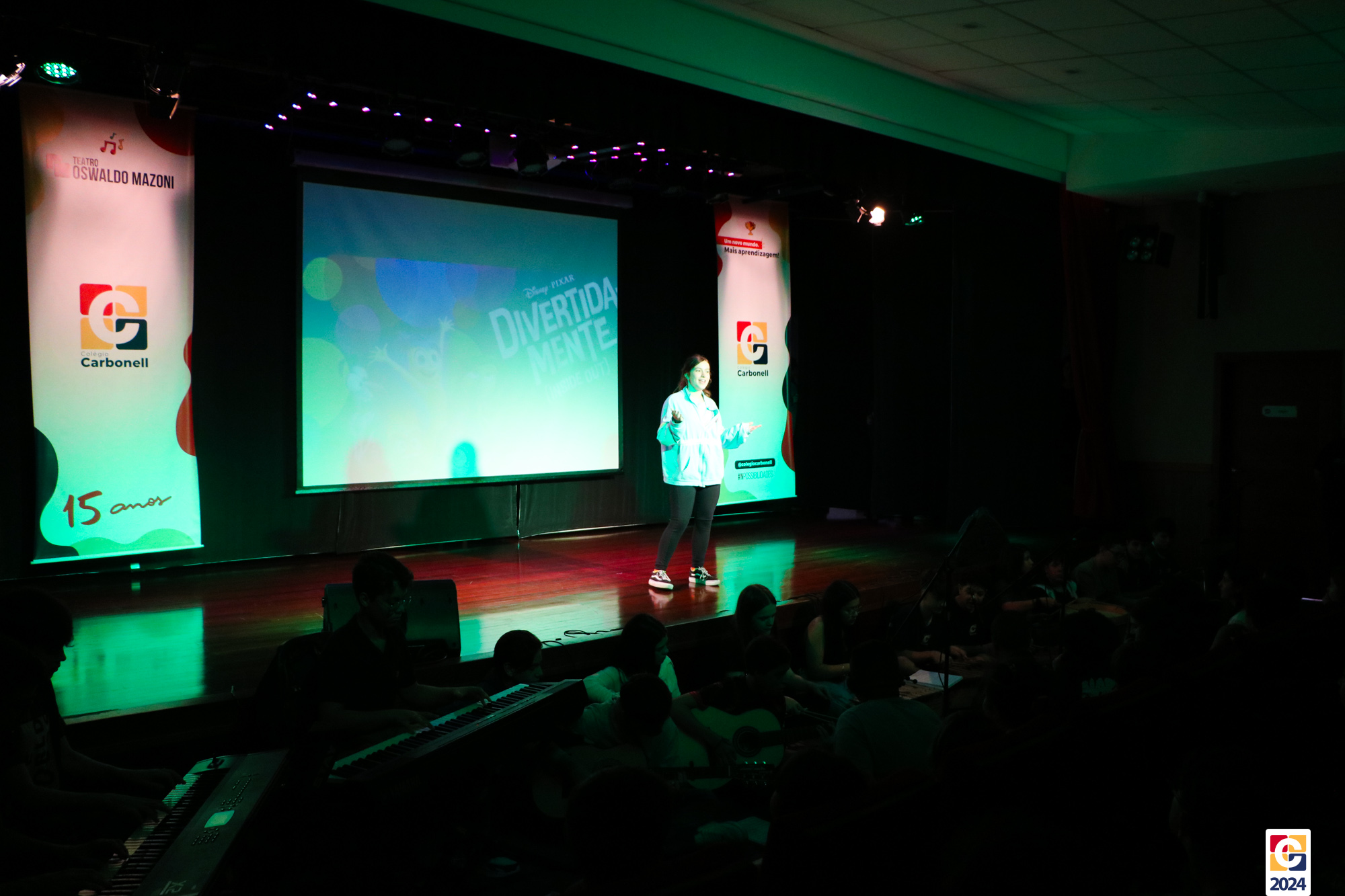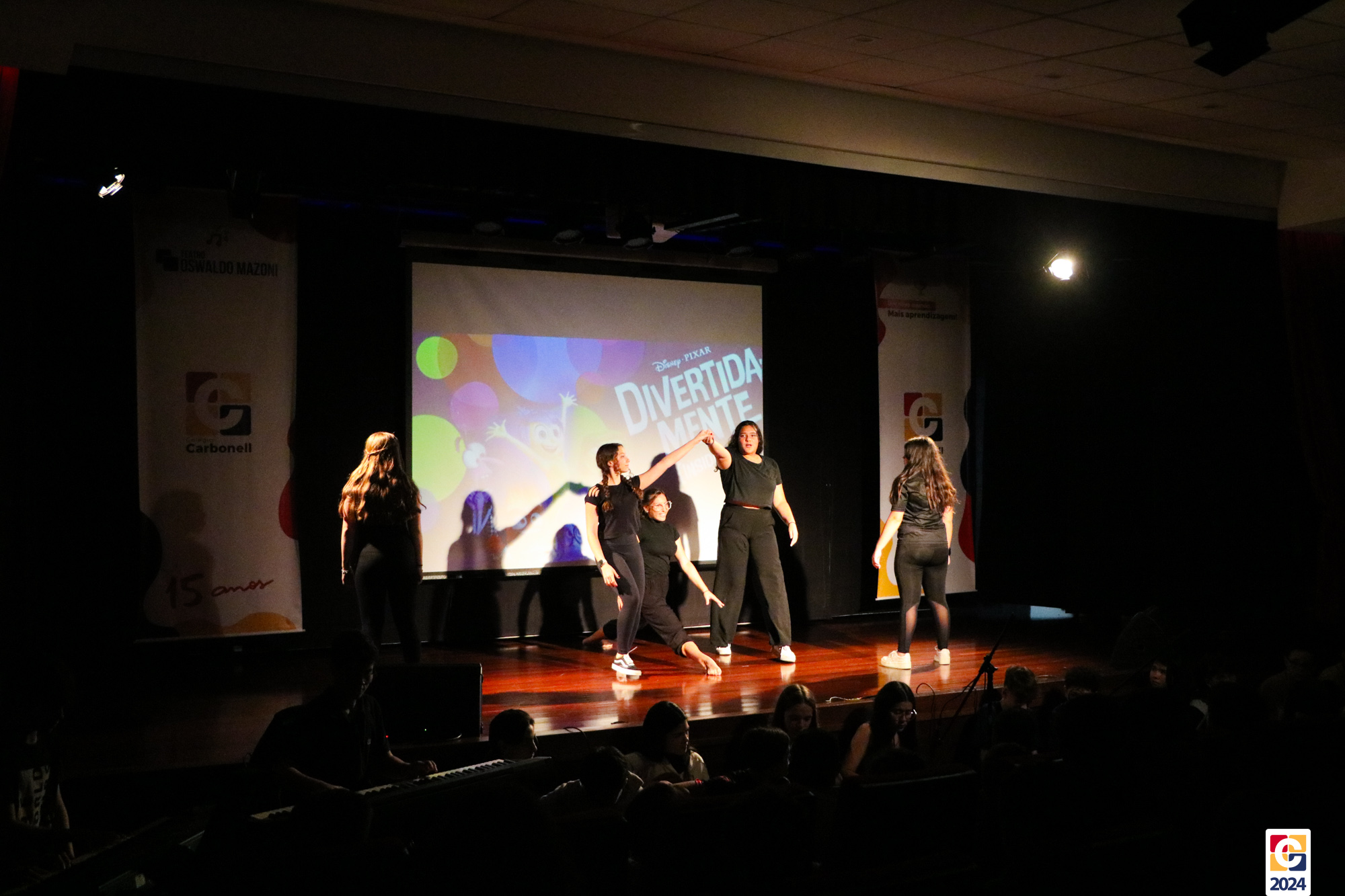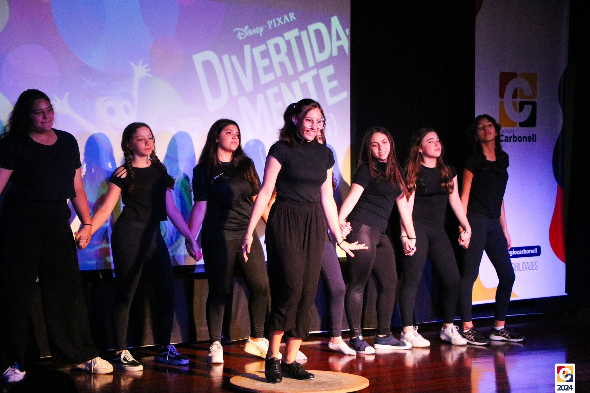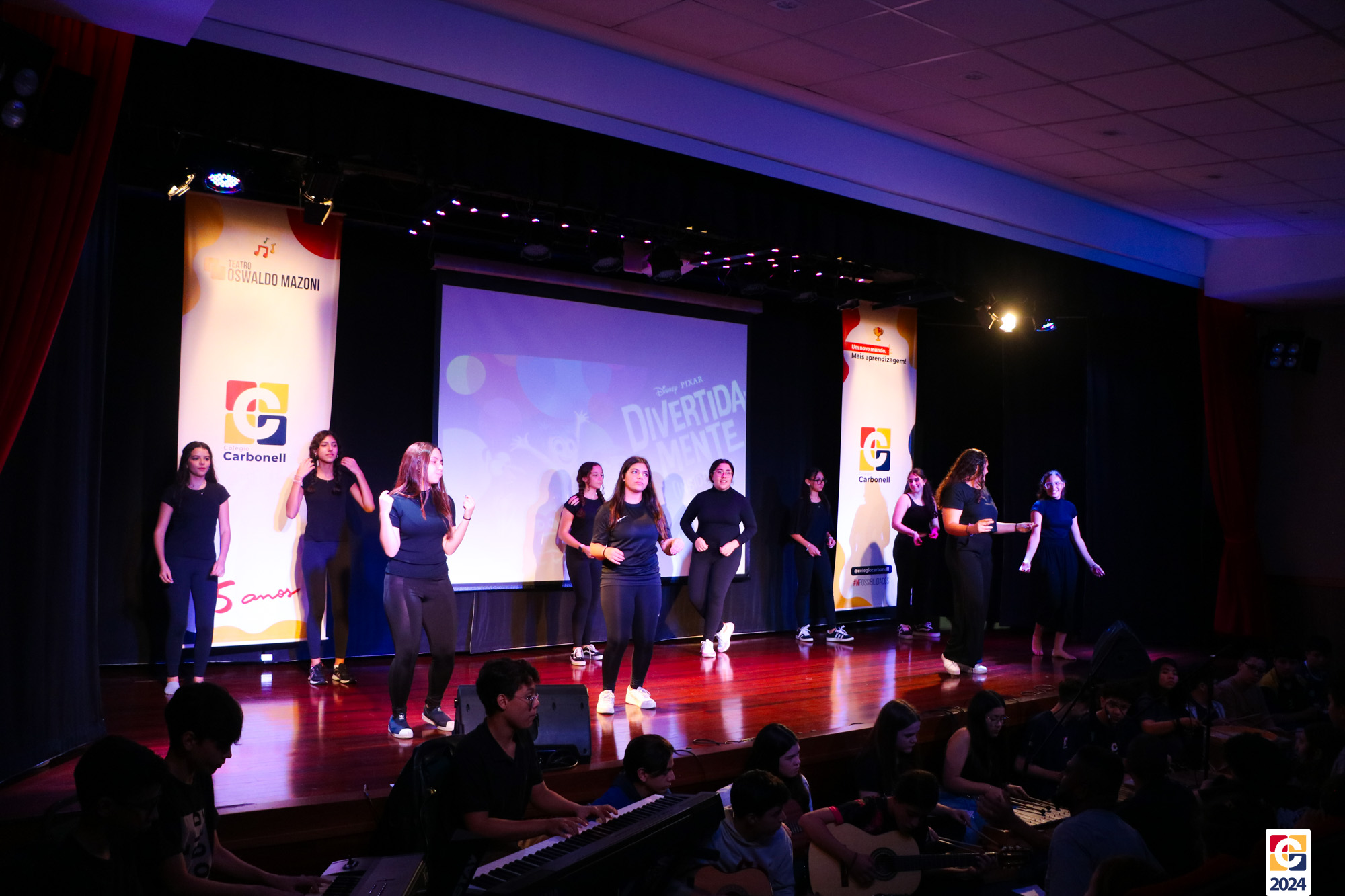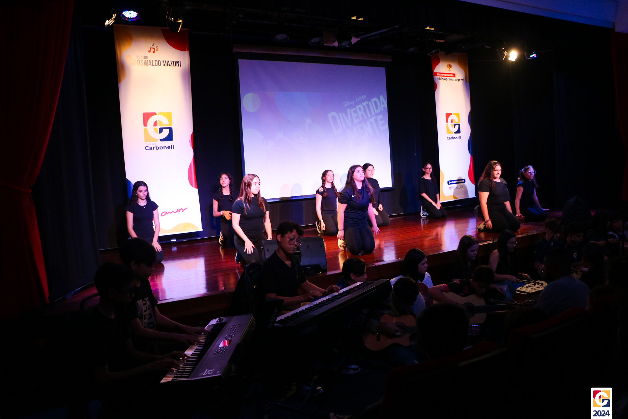 Os estudantes dos 8º anos do Colégio Carbonell protagonizaram uma apresentação especial da peça Divertida Mente no Teatro Oswaldo Mazoni, direcionada para as crianças dos Anos Iniciais. A história gira em torno de Riley, uma menina que enfrenta mudanças em sua vida, e suas emoções personificadas — Alegria, Tristeza, Medo, Raiva e Nojinho — que a ajudam a lidar com essas transições. A obra aborda temas como amizade, crescimento emocional e a importância de todas as emoções. 🌈
