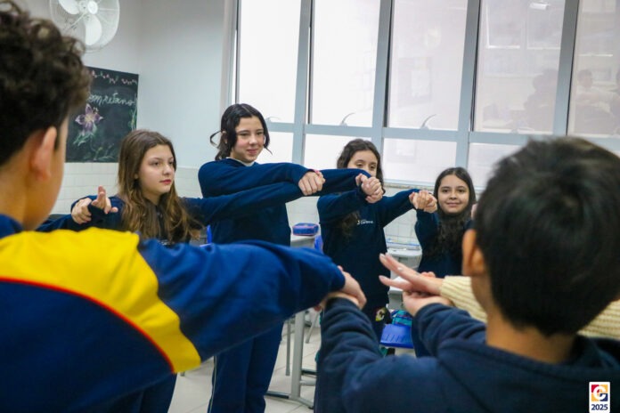 Nas aulas de Projeto de Vida, os estudantes dos Anos Finais participaram de uma dinâmica que mostrou, de forma prática, como o cérebro e o corpo reagem quando estão sobrecarregados ou quando a responsabilidade não é dividida igualmente. Na atividade, todos deram as mãos e levantaram e abaixaram os braços ao comando da professora Thais Sanjurjo. O grupo logo percebeu que, quando todos realizavam o mesmo movimento, a tarefa era leve e simples. Mas, quando alguns mantinham o braço parado ou faziam o contrário, a atividade se tornava pesada e difícil de sustentar. 🤝🏼