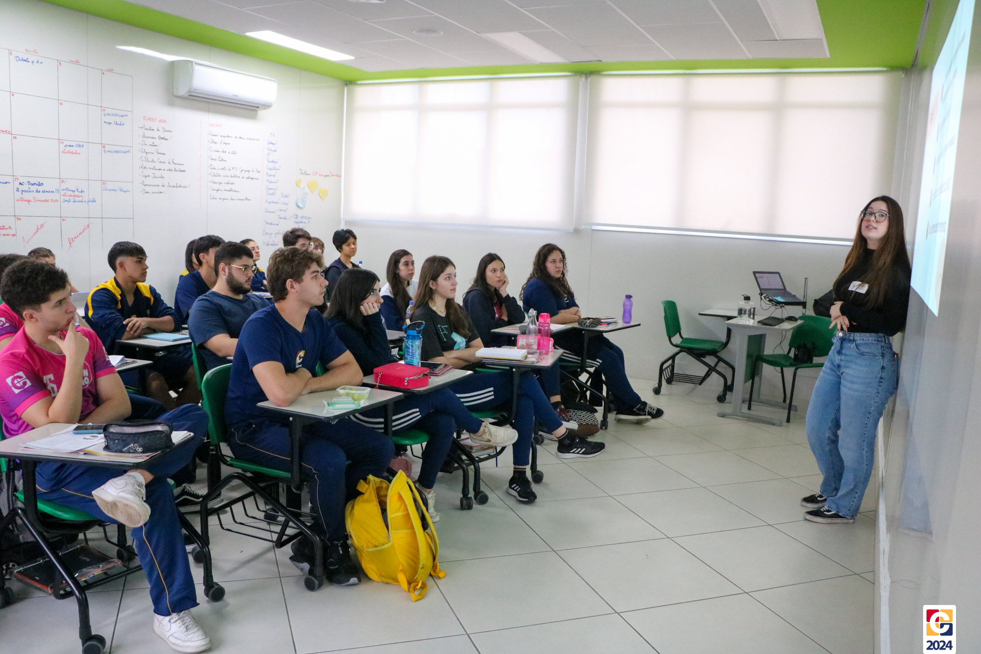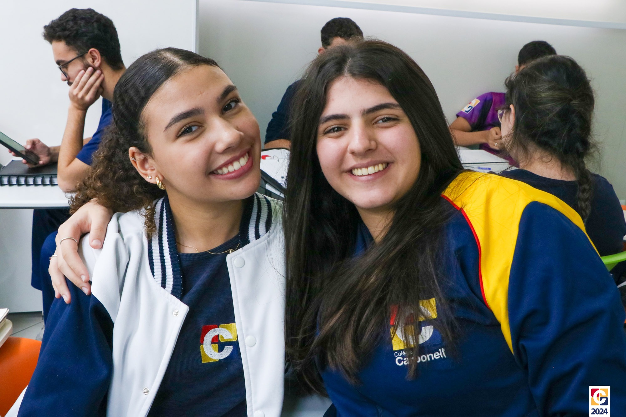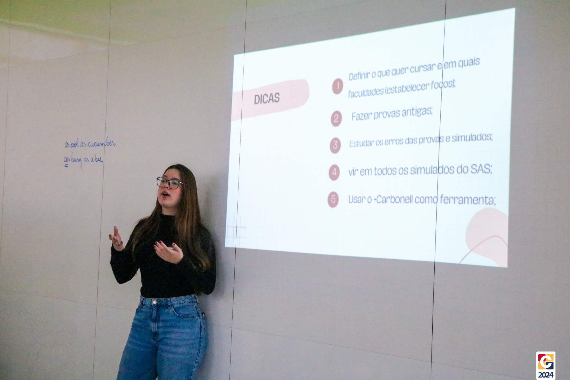 Formada na Turma 2023 do Carbonell, Letícia Zanini retornou ao colégio para encontrar amigos, professores, colaboradores e as turmas em formação neste ano. A estudante, que se formou no ano passado, voltou este ano para visitar e conversar com o Ensino Médio (2ª e 3ª séries) sobre organização de estudos para o vestibular, a escolha da carreira, como se deu o processo de preparação e como está a vida universitária. Contemplados no encontro (24) foram a 2ª série (Turma 2025) e o Terceirão (Turma 2024). 📚