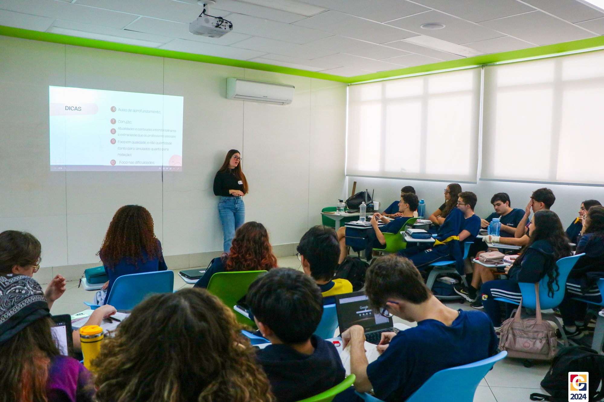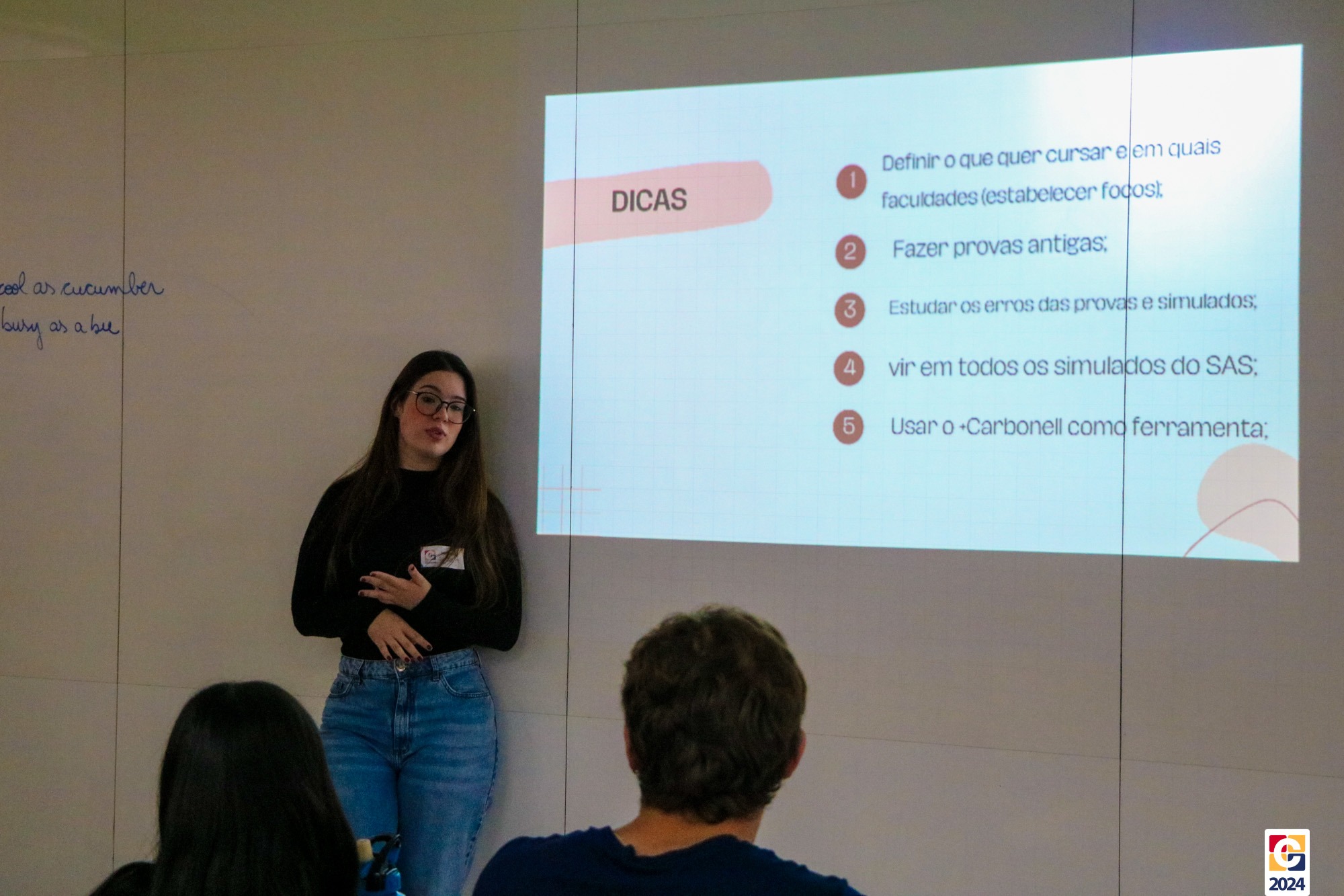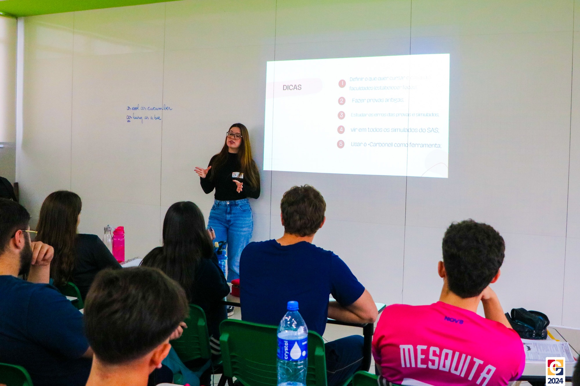 Formada na Turma 2023 do Carbonell, Letícia Zanini retornou ao colégio para encontrar amigos, professores, colaboradores e as turmas em formação neste ano. A estudante, que se formou no ano passado, voltou este ano para visitar e conversar com o Ensino Médio (2ª e 3ª séries) sobre organização de estudos para o vestibular, a escolha da carreira, como se deu o processo de preparação e como está a vida universitária. Contemplados no encontro (24) foram a 2ª série (Turma 2025) e o Terceirão (Turma 2024). 📚
